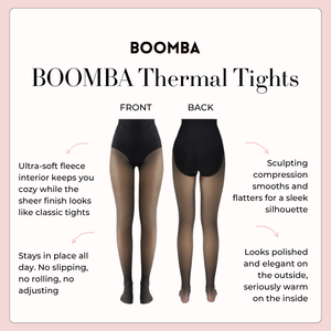 Meet BOOMBA Thermal Tights. Designed to look like your favorite sheer tights, but secretly lined with ultra-soft fleece to keep you cozy all season long. Perfect for layering under dresses, skirts, or oversized sweaters without the bulk.