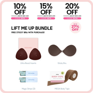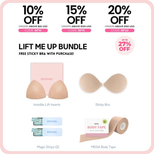 How to Remove: To remove your sticky bra, unclasp and gently peel off one cup at a time, starting from the top outer edge. Reapply protective films onto the sticky bra and store back into the BOOMBA gift box, away from direct sunlight.