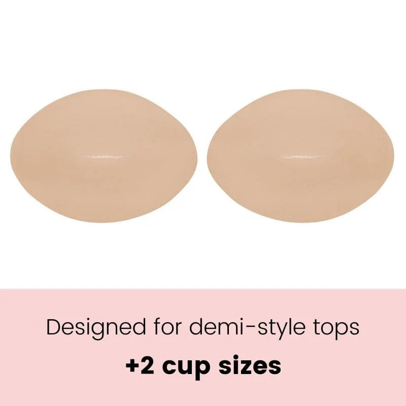 The Demi Boosts are a shortened version of the Ultra Boost inserts. The Demi Boost inserts add up to TWO cup sizes, giving you that gorgeous cleavage instantly. The oval shaped design ensures it stays hidden in tops that feature sweetheart necklines.
