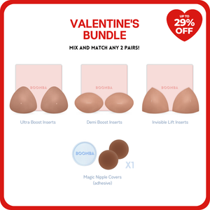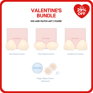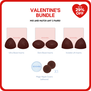 Our limited-time Valentine’s Bundle is here. Two pairs of your favorite BOOMBA inserts plus our best-selling Magic Nipple Covers. The ultimate self-love treat this Valentine’s Day