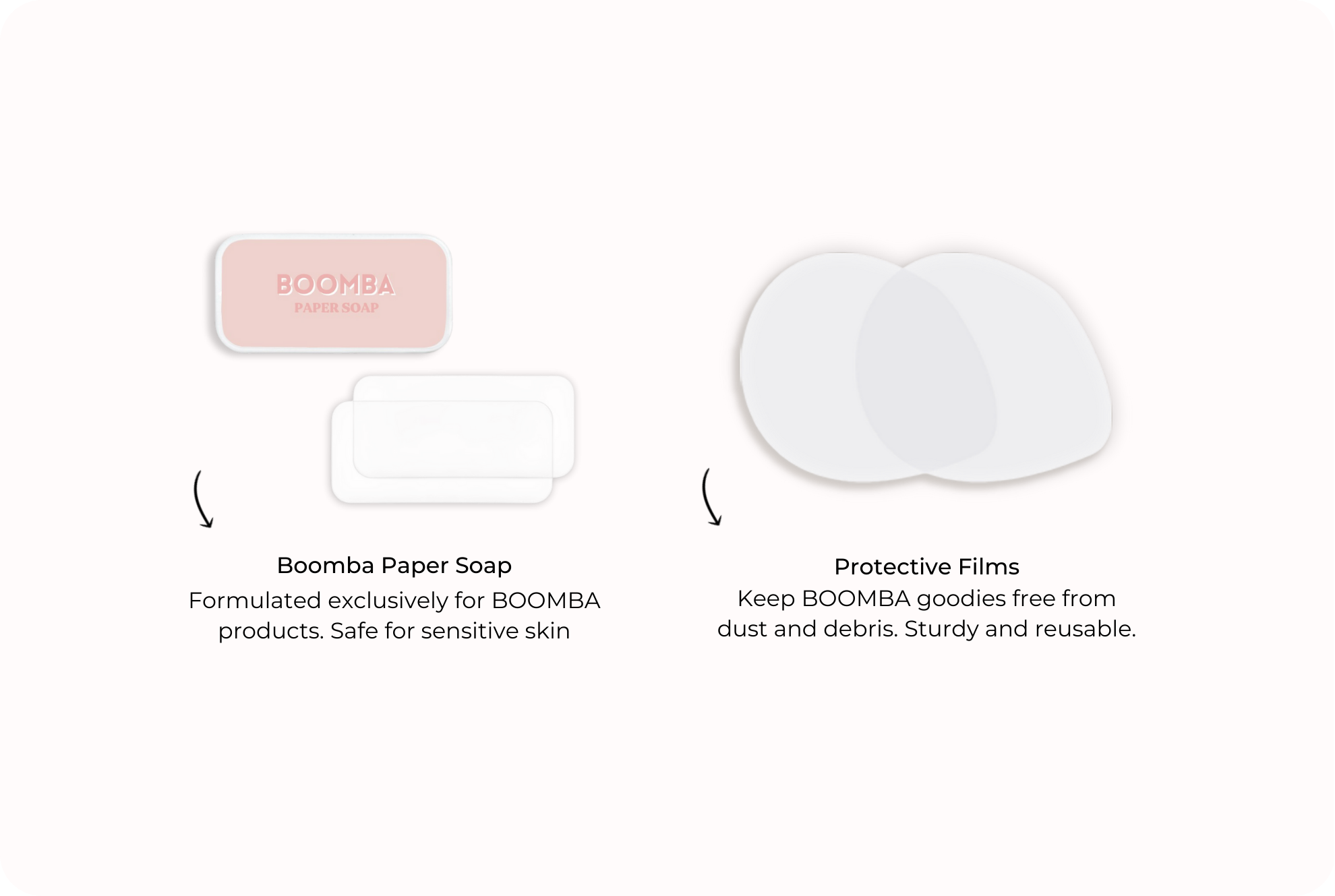 BOOMBA Paper Soap: Our specially formulated cleansing solution is designed to remove dirt, oils, and residue from your sticky bras without compromising their adhesive properties. It's mild on your skin and the bra, ensuring longevity.