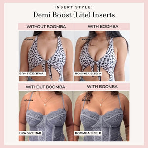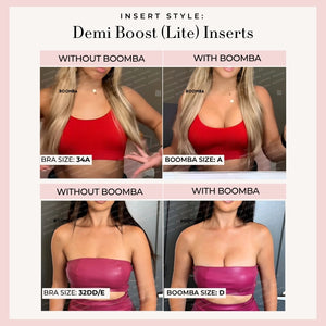 Demi Boost (Lite) Inserts are abalone-shaped inserts that increase your cup size by one cup. They give your bust a fuller look when you wear those plunging necklines and low-cut dresses.