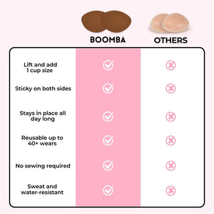 Unlike a sticky bra that is supported by adhesive, BOOMBA inserts are supported by the clothing and cannot stay up by themselves. It is crucial to wear them in tight, structured, and fitted tops.