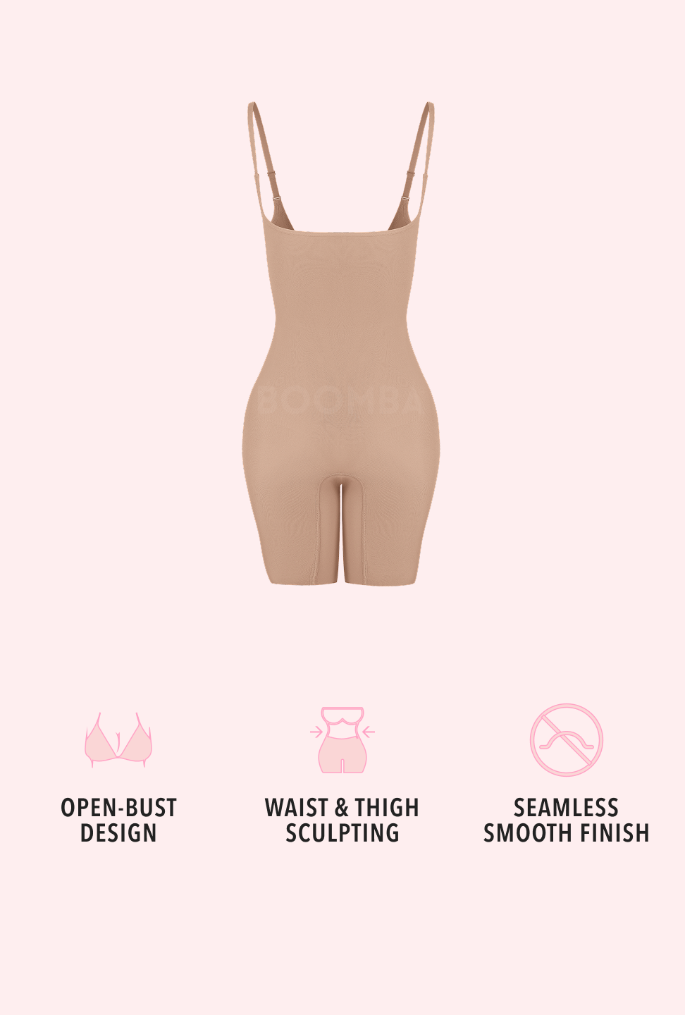 Lift and smooth with targeted shaping, an open-bust fit, and mid-thigh coverage.