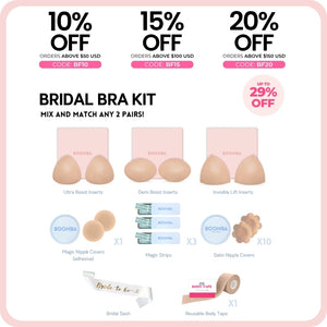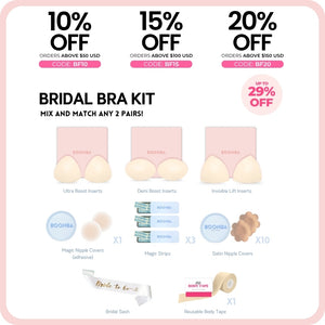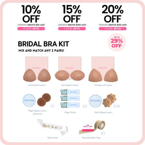 Get completely wedding-ready with the BOOMBA’s Bridal Bra Kit Bundle that has everything a bride needs. From preventing wardrobe malfunctions to creating a more flattering shape, this bundle got you covered.