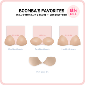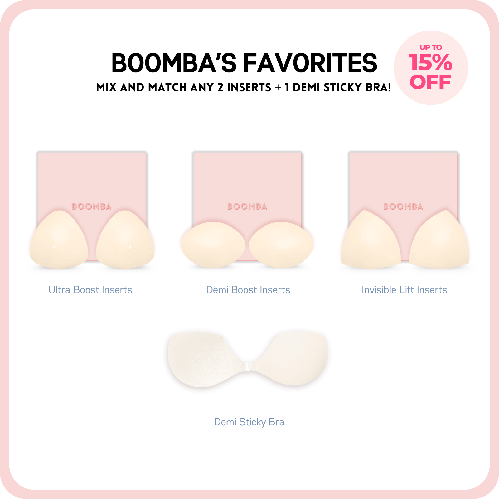 This bundle contains 2 of our best-selling inserts of your choice and the BOOMBA Demi Sticky Bra. Hand-picked as our personal faves, this bundle includes all the essentials you need to look great and feel great on any occasion.
