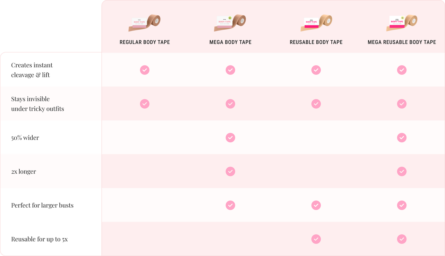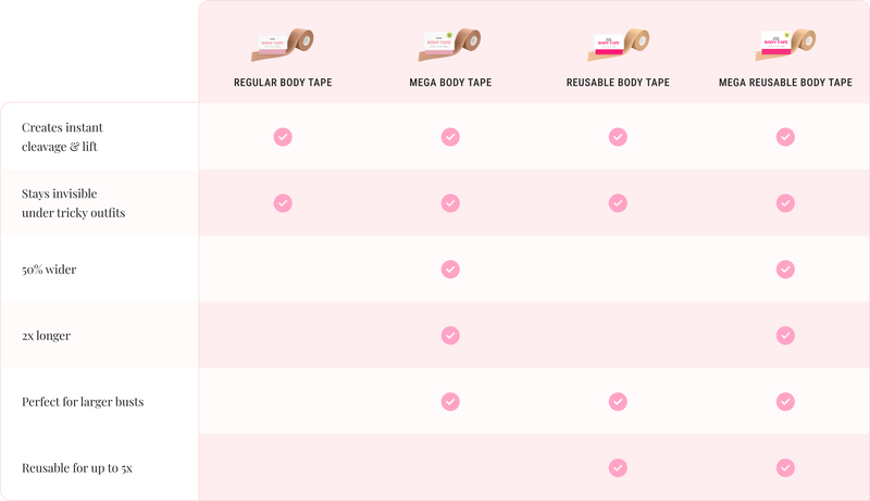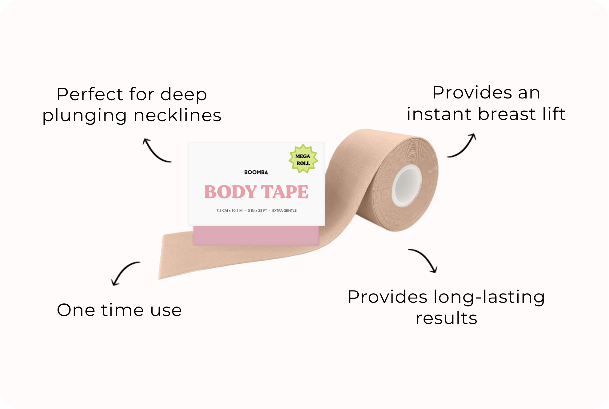 BOOMBA's Mega Body Tape can be worn in various ways. Designed to contour with your shapes, our body tape is gentle yet strong, providing long-lasting results for up to 12 hours.
