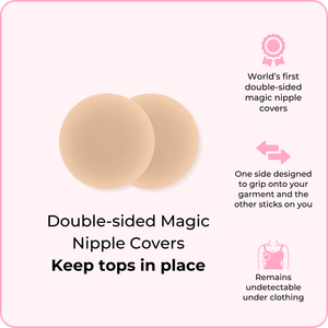 World’s first Double-sided Magic Nipple Covers, one side designed to grip onto your garment and the other sticks on you. Keeps clothing in place while remaining undetectable under your clothing.