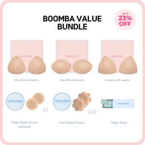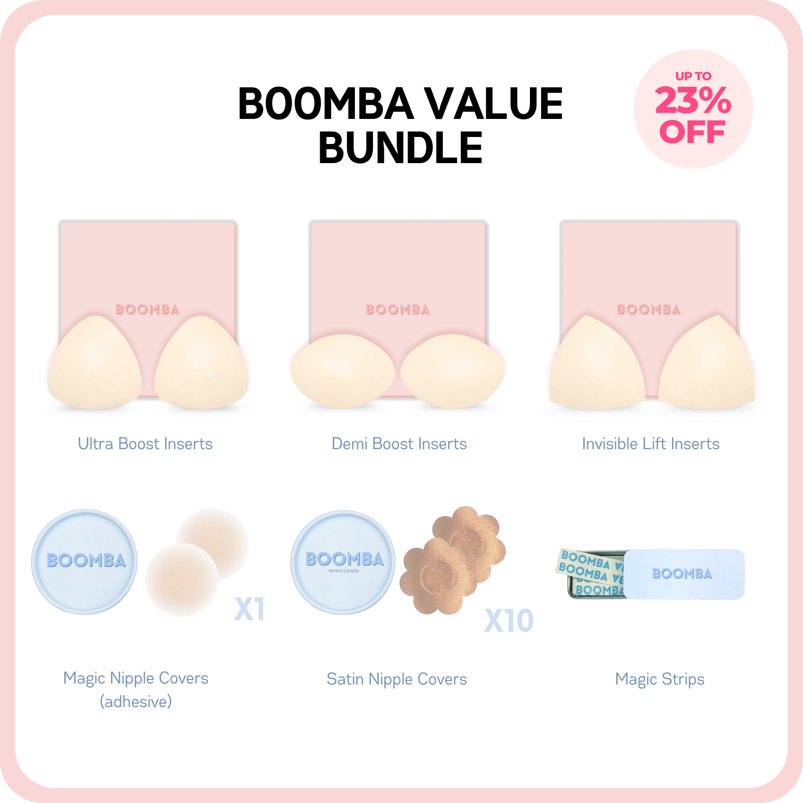 This bundle contains all three styles of our popular inserts, Ultra Boost, Demi Boost, and Invisible Lift. It also contains our best-selling Magic Nipple Covers (adhesive), Satin Nipple Covers, and BOOMBA Magic Strips.