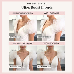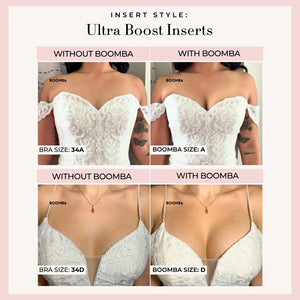 Please note that results may vary depending on breast size and shape. Results will be similar to a double push up bra. BOOMBA padded inserts work best with natural breasts.