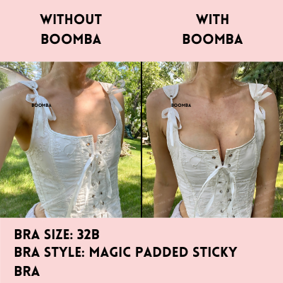 Enter: Magic Padded Sticky Bra. BOOMBA is famous for its patented double-sided adhesive inserts that instantly boost up to TWO cup sizes. And recently, we just launched our first-ever padded stick-on bra that has a unique padded design! No bulky push up padding to weigh you down. Our Magic Padded Sticky Bra is perfect for outfits that you normally cannot use our inserts in. (Think: knitted and loose tops)