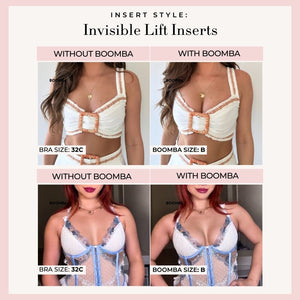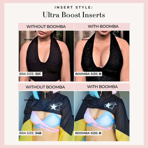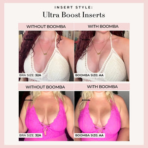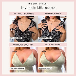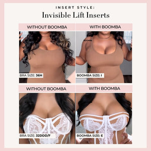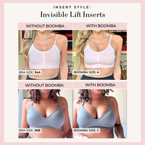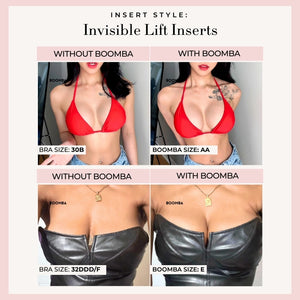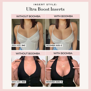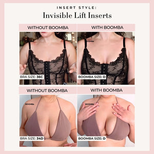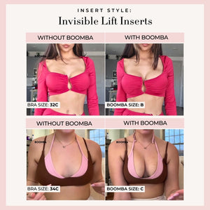 Please note that results may vary depending on breast size and shape. Results will be similar to a double push up bra. BOOMBA padded inserts work best with natural breasts.