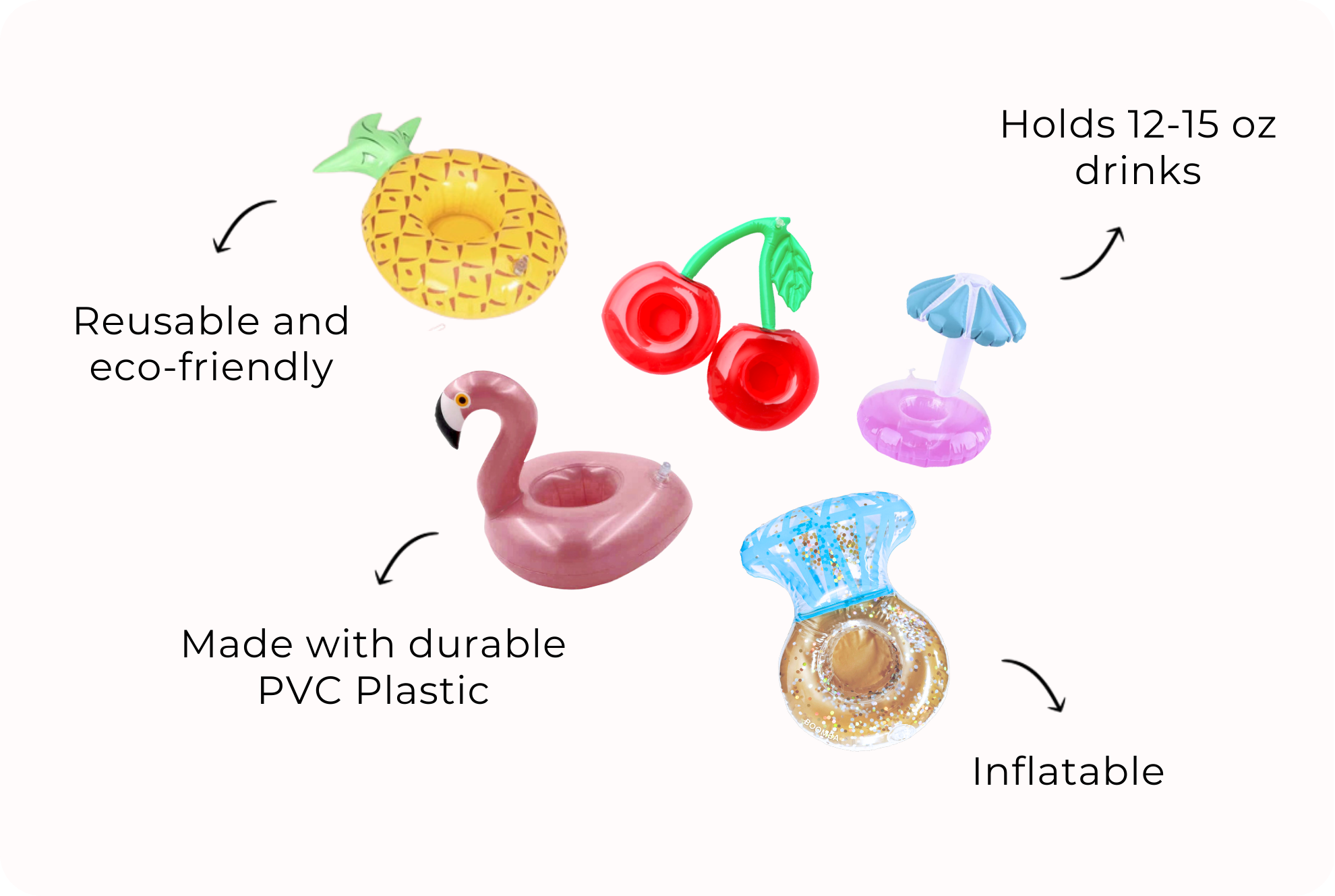 Mini Inflatable Drink Floaties are the ultimate fun and luxurious cup holders that are perfect for adults and kids alike. Make any drink enchanting with these magically sized drink floaties. Relax by the swimming pool, at the beach or the lake while effortlessly reaching your drink floating beside you.
