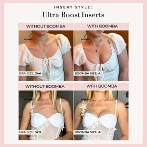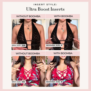 Please note that results may vary depending on breast size and shape. Results will be similar to a double push up bra. BOOMBA padded inserts work best with natural breasts.