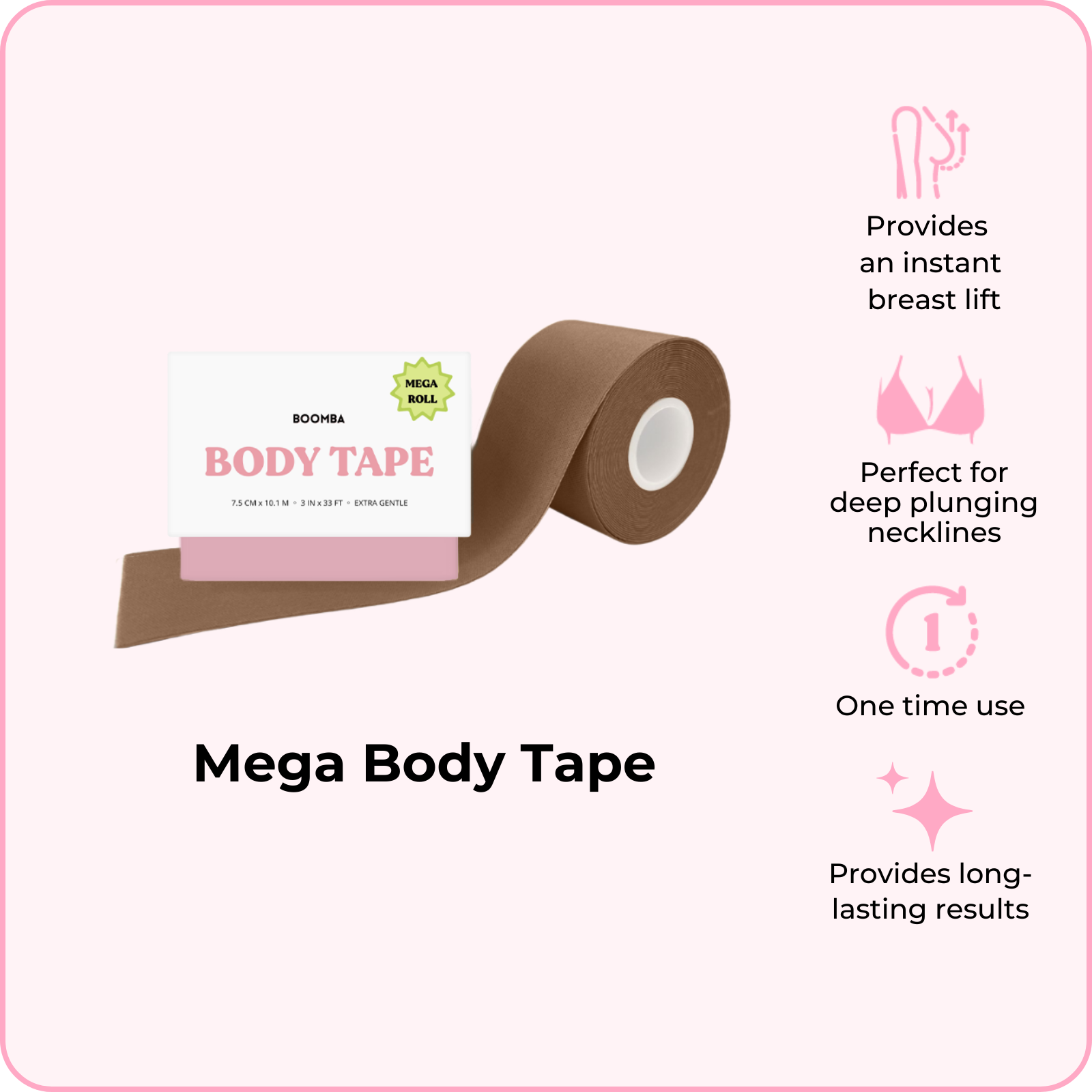BOOMBA's Mega Body Tape can be worn in various ways. Designed to contour with your shapes, our body tape is gentle yet strong, providing long-lasting results for up to 12 hours.