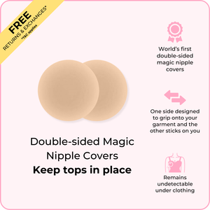 World’s first Double-sided Magic Nipple Covers, one side designed to grip onto your garment and the other sticks on you. Keeps clothing in place while remaining undetectable under your clothing.