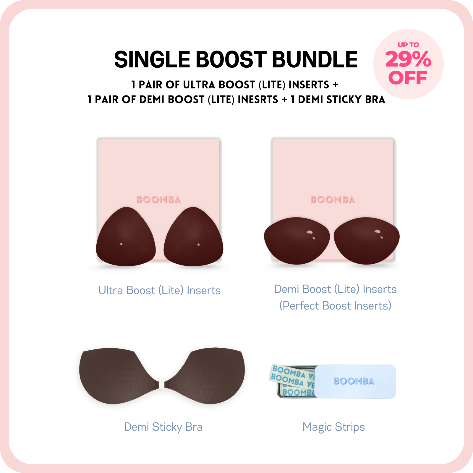 Looking for a natural-looking boost? Our Single Boost Bundle is made for you! Featuring the thinner versions of our best-selling Ultra Boost (Lite) and Demi Boost (Lite) Inserts. These Lite versions still deliver a noticeable lift and boost, just without the extra padding. Instantly add up to one cup size for a natural, everyday enhancement. Perfect for when you want a boost that’s low key but still high impact.
