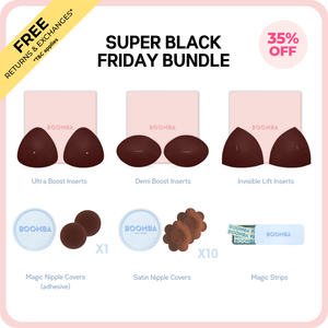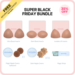 This bundle contains all three styles of our popular inserts, Ultra Boost, Demi Boost, and Invisible Lift. It also contains our best-selling Magic Nipple Covers (adhesive), Satin Nipple Covers, and BOOMBA Magic Strips.