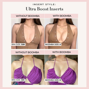 Please note that results may vary depending on breast size and shape. Results will be similar to a double push up bra. BOOMBA’s padded inserts work best with natural breasts.
