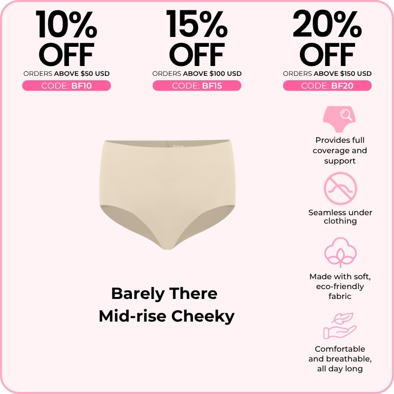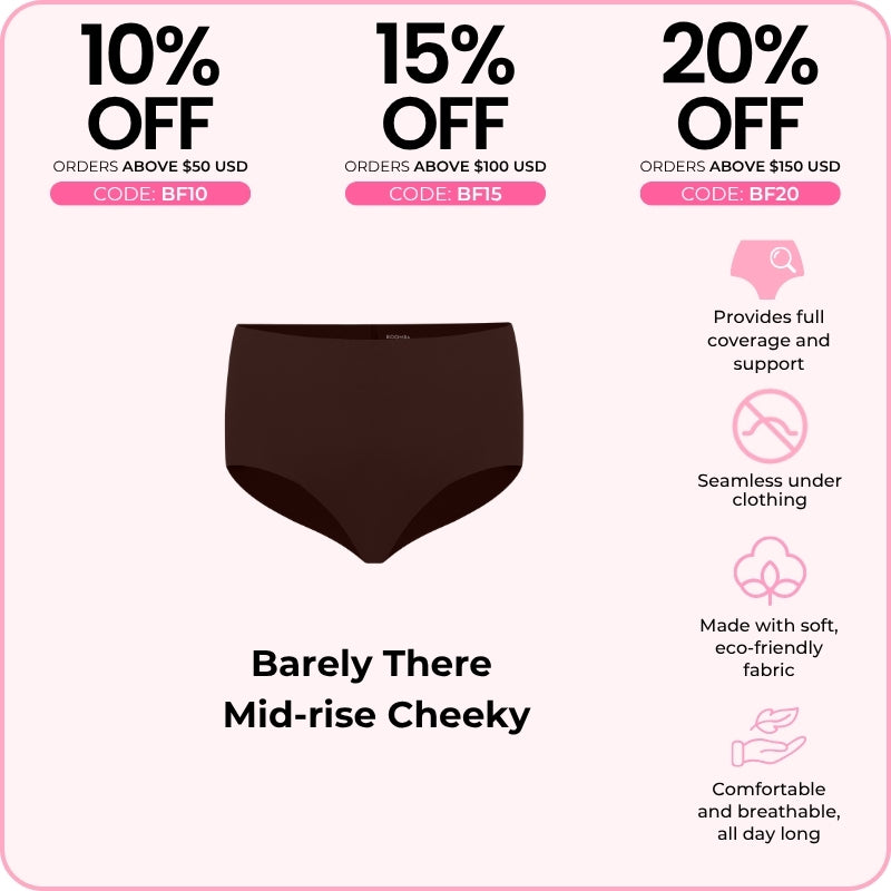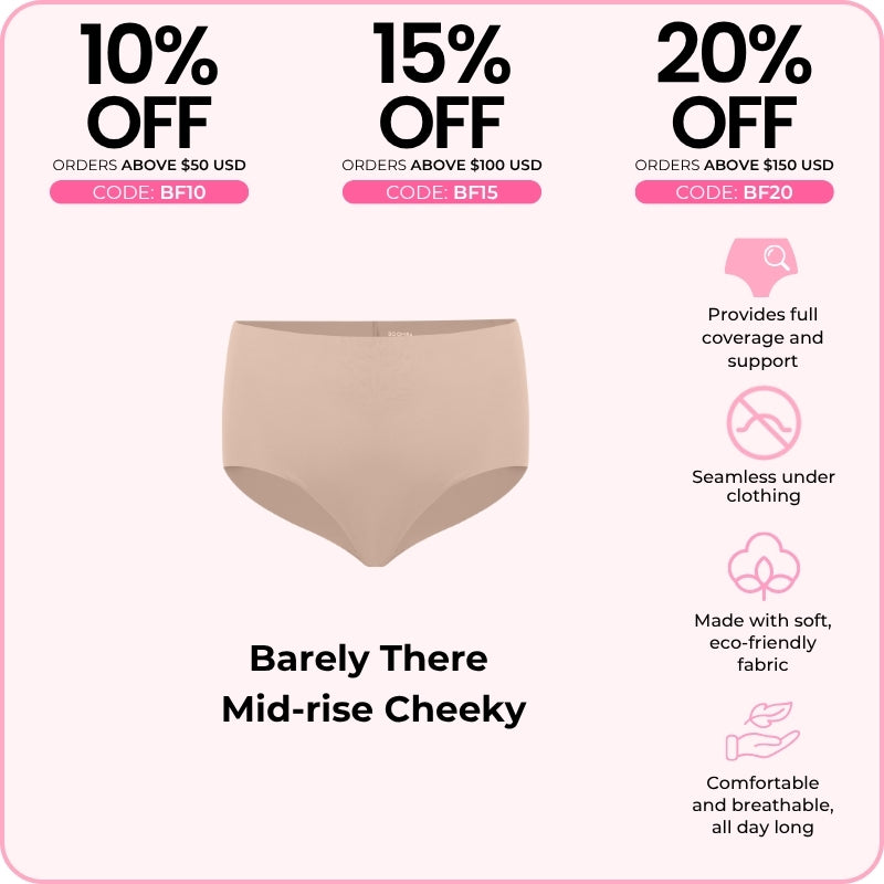 The BOOMBA Barely There Mid-Rise Cheeky is like a hug for your hips—comfy, cute, and totally invisible! With ultra-soft, seamless fabric, it feels like you’re wearing nothing (but in the best way). The mid-rise cut and cheeky back give you a flattering shape, making it your new go-to for everything from Netflix binges to date nights. Slip into this cheeky little number and feel fab all day long!