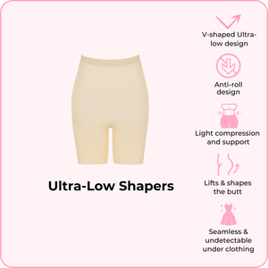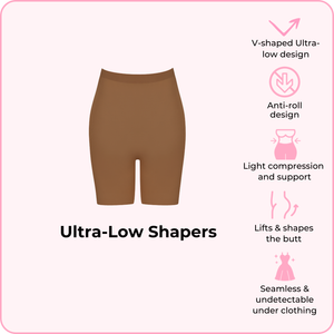 Experience comfort and confidence with BOOMBA’S Ultra-low Shapers. Featuring a sleek V-shaped Ultra-low cut, this style provides light shaping and support while staying invisible under daring outfits. Ultra lightweight and breathable, this style is perfect for wedding dresses, backless gowns, and everyday wear.