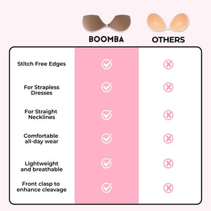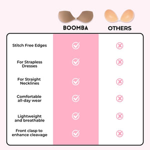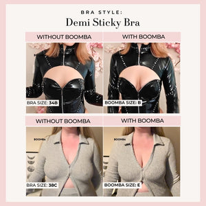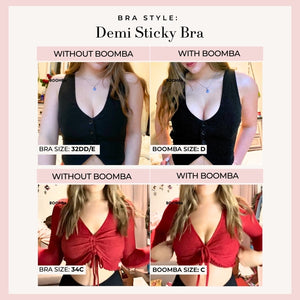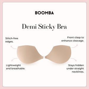 BOOMBA’s Demi Sticky Bra has a unique patented design. The bra cups in our Demi Sticky Bra are cut lower to ensure it always stays hidden under your top. The bra cups mold to fit your natural curves to provide natural-looking cleavage. Its stitch-free edging ensures it stays smooth under your clothing for a seamless look.