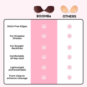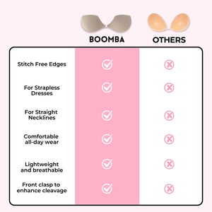 How to Remove: To remove your sticky bra, unclasp and gently peel off one cup at a time, starting from the top outer edge. Reapply protective films onto the sticky bra and store back into the BOOMBA gift box, away from direct sunlight.