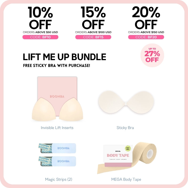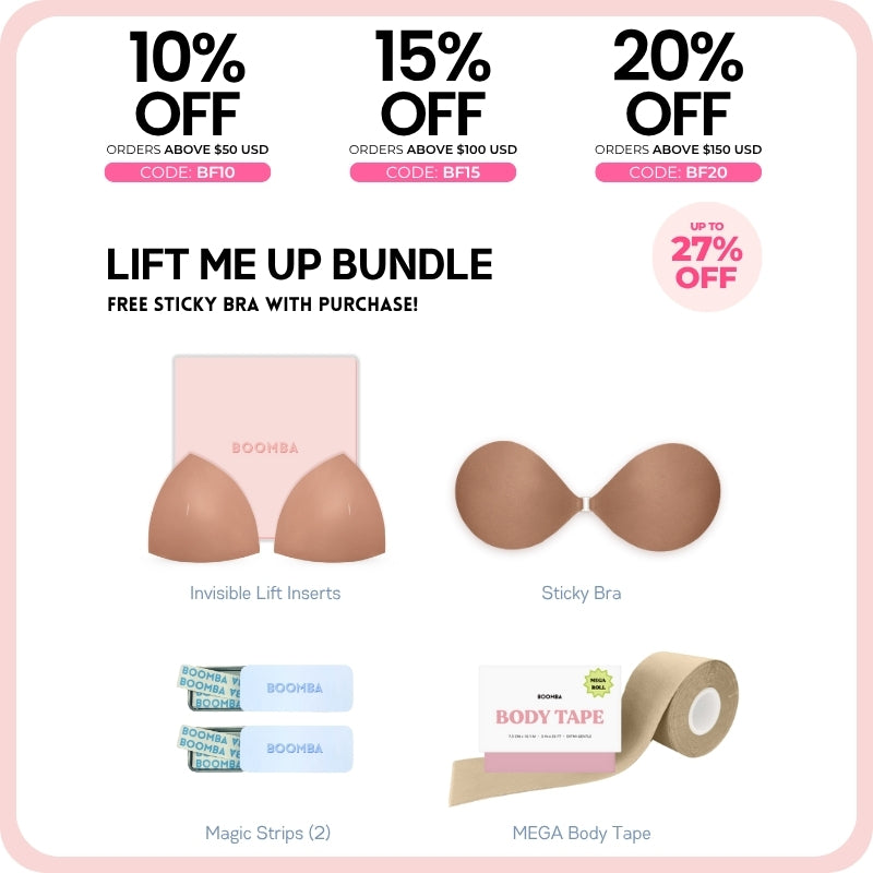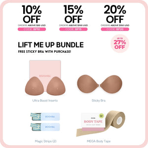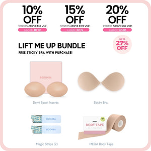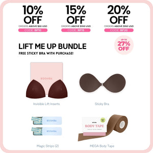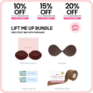 How to Remove: To remove your sticky bra, unclasp and gently peel off one cup at a time, starting from the top outer edge. Reapply protective films onto the sticky bra and store back into the BOOMBA gift box, away from direct sunlight.
