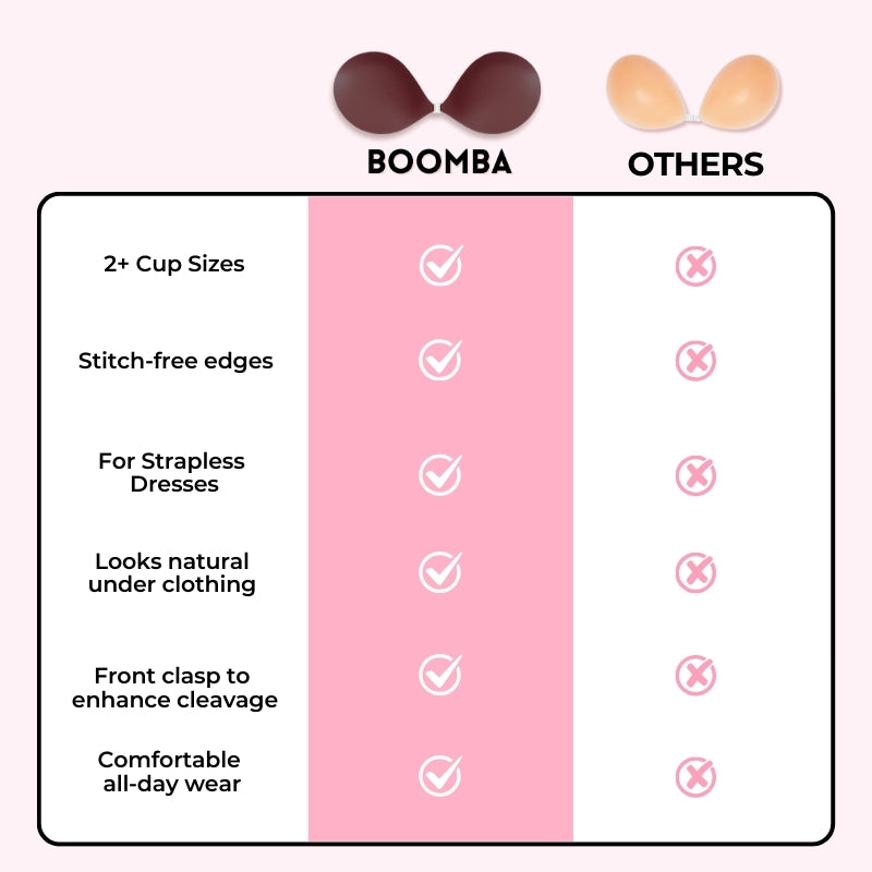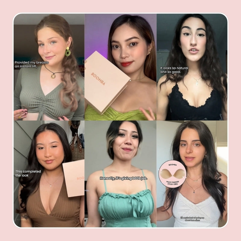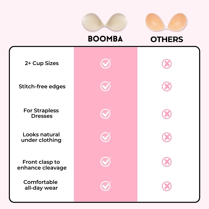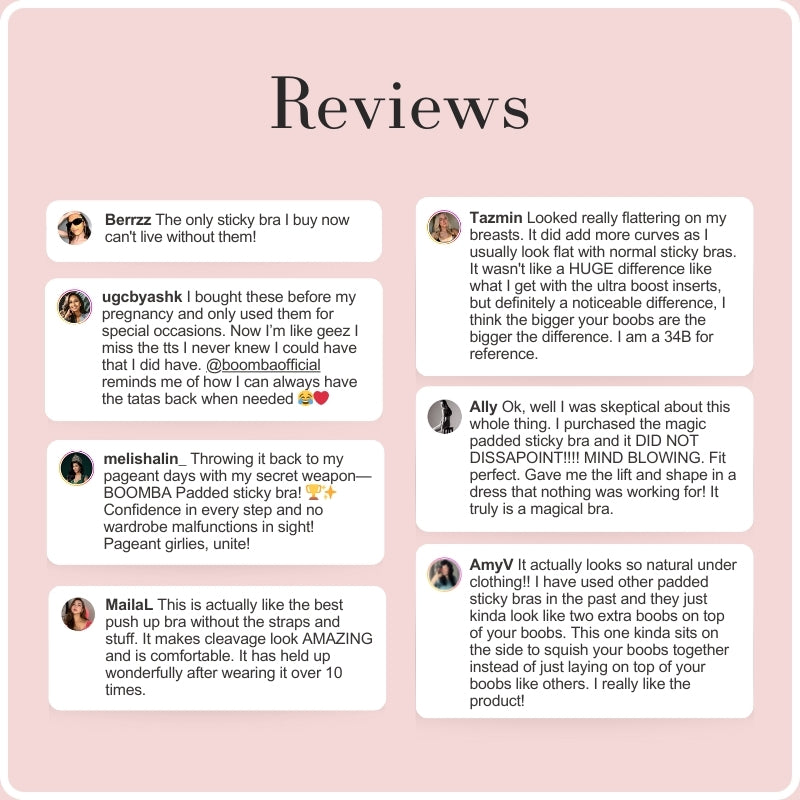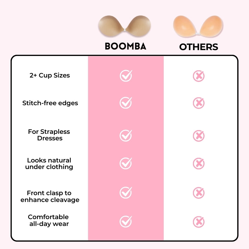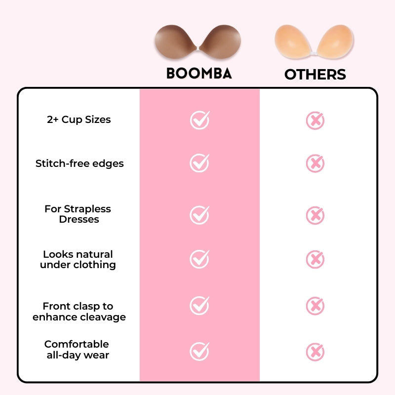 The natural padding in BOOMBA’s sticky bra eliminates the look of bulkiness that other padded sticky bras usually have. Ours is designed to curve with your breasts, creating a natural fuller look.