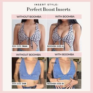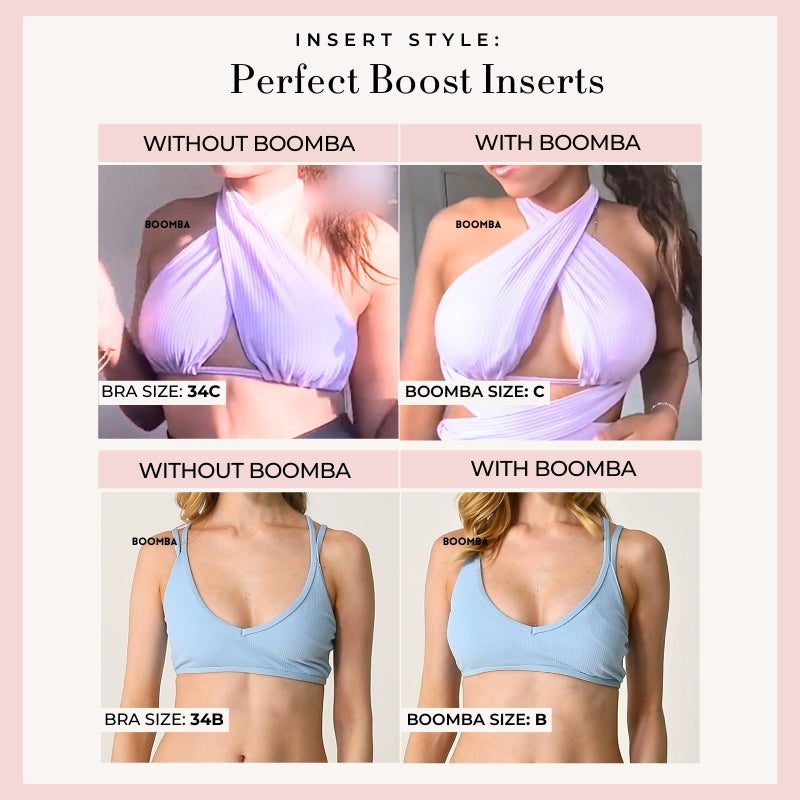 Please note that results may vary depending on breast size and shape. Results will be similar to a push up bra. BOOMBA padded inserts work best with natural breasts.