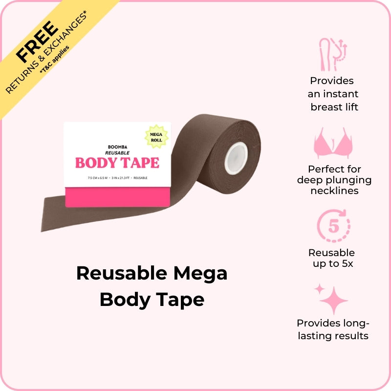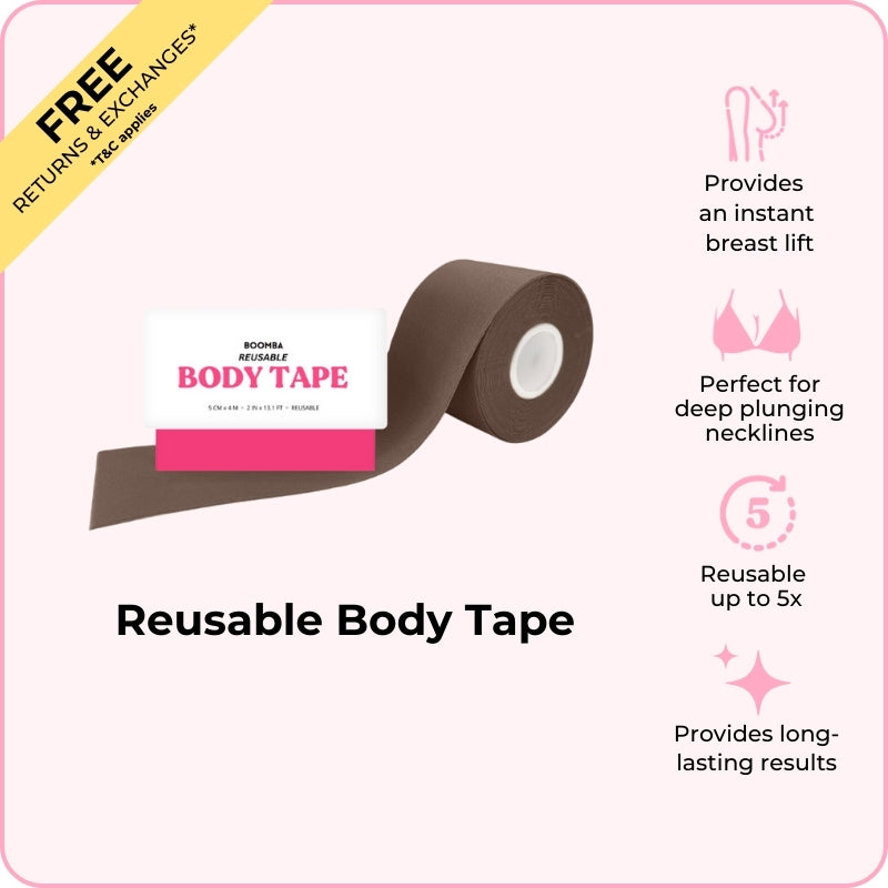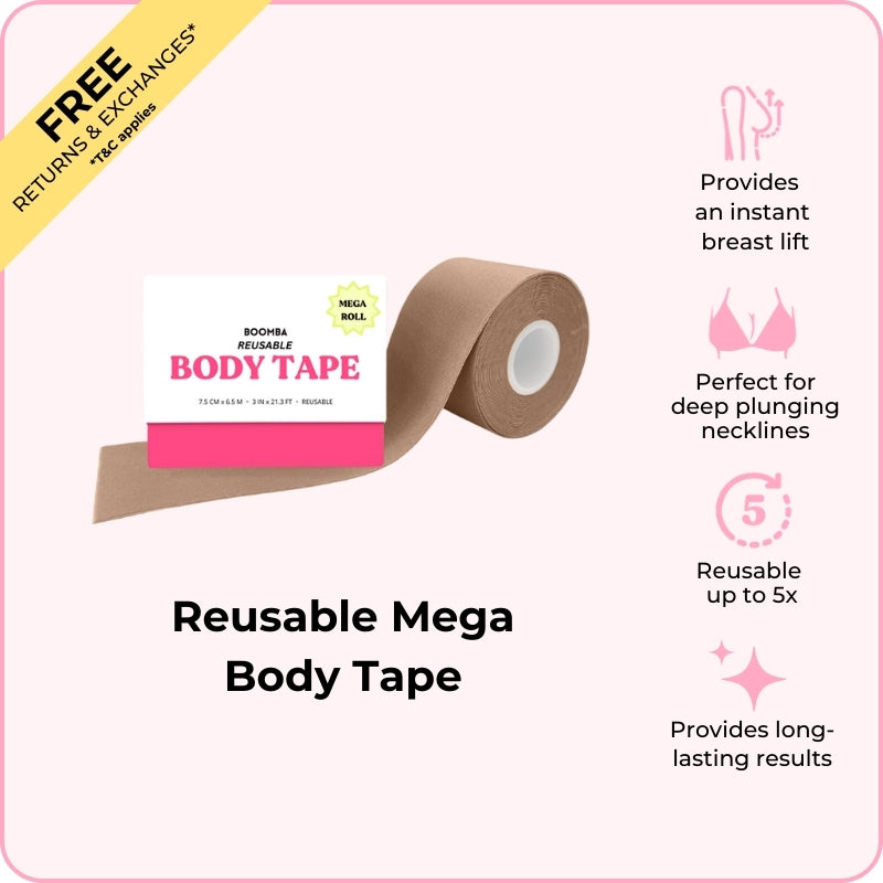 BOOMBA's Reusable Body Tape can be reusable up to five times. Designed to contour with your shapes, our body tape is gentle yet strong, providing long-lasting results for up to 12 hours.