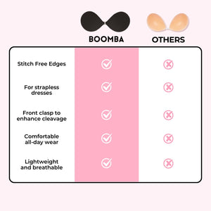 How to Remove: To remove your sticky bra, unclasp and gently peel off one cup at a time, starting from the top outer edge. Reapply protective films onto the sticky bra and store back into the BOOMBA gift box, away from direct sunlight.